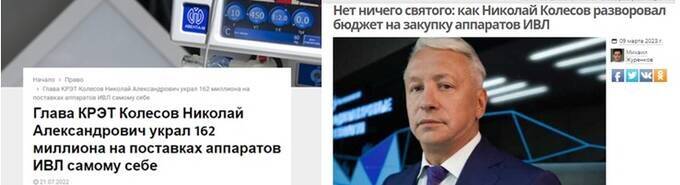 Ценник на каждый такой аппарат ИВЛ составлял приблизительно 1,7 млн руб. Только за 2020-й год страна закупила у Колесова свыше 11 000 приборов. На этом его компания КРЭТ смогла тогда заработать около 20 млрд рублей. Как писали СМИ, Николай Александрович украл 162 миллиона на этом схематозе.