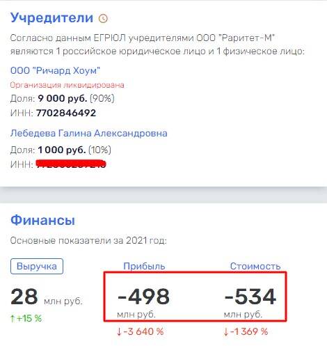 При выручке в 2021 г. 28 млн руб. компания понесла убыток 498 млн руб. и отрицательный капитал составил 534 млн руб. В плюс никогда не работала. Все деньги уходили в офшоры ООО «Ричард Хоум», за которыми могла стоять Надежда Гришаева, бывшая баскетболистка и спутница Игоря Лебедева, сына Владимира Жириновского.