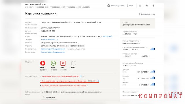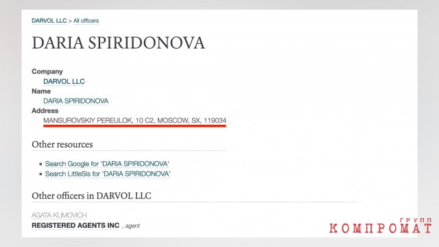 О том, что американский проект затевала не тёзка Спиридоновой, говорит личная карточка бизнесвумен. Согласно документу, при регистрации американской фирмы учредитель DARVOL LLC указала свой российский адрес — в Мансуровском переулке, где расположен головной офис ювелирного дома Дарьи Спиридоновой.