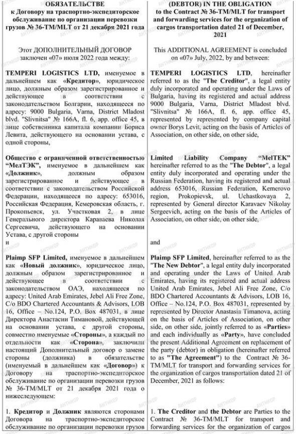 В то же время в ОАЭ Дмитрий Коваленко имеет еще одну фирму – Plaimp SFP limited. По сути это что-то вроде кредитного союза, который выступает в качестве скупщика долгов. Как видно из дополнительного договора от 7 июля 2022 года, одним из таких должников является компания российского миллиардера Константина Струкова "МелТЭК".