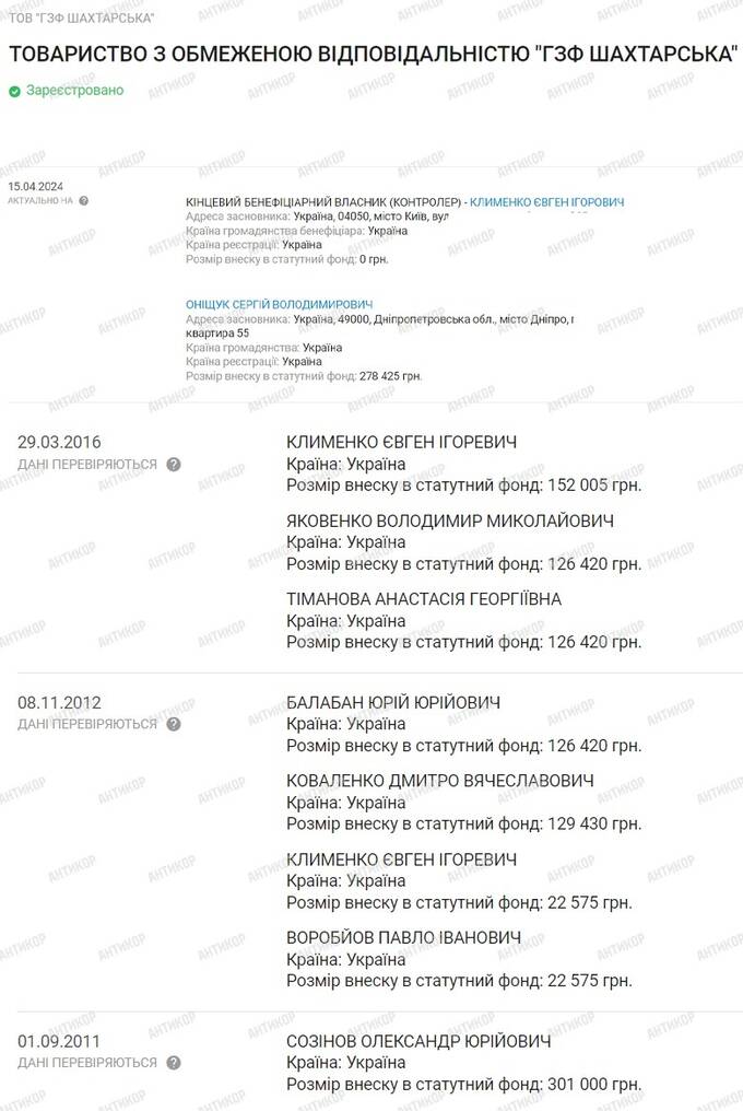 Согласно данным украинских реестров, на апрель 2024 года одним из бенефициаров предприятия был Евгений Клименко, а ранее в списке учредителей можно увидеть и Дмитрия Коваленко.