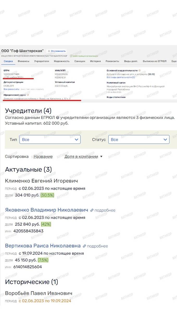 Украинский реестр содержит примечание, что с 1 июня 2023 г. ГЗФ «Шахтерская» внесена в Единый государственный реестр юридических лиц Российской Федерации. В то же время по данным российского реестра это предприятие платит налоги в карман Кремля с ноября 2022 года. В списке учредителей в реестре РФ то же имя, что и в украинском – Евгений Клименко. Вместе с ним среди бывших руководителей отмечены Владимир Яковенко и Павел Воробьев. Эти же лица ранее руководили ГЗФ «Шахтерская» в Украине вместе с угольным бизнесменом Дмитрием Коваленко и директором его дубайской компании Анастасией Тимановой. Следовательно, одни и те же лица руководят предприятием и в Украине, и в России.