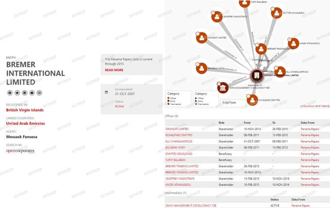 Оба «дельца» были в числе акционеров фирмы Bremer international limited с регистрацией в офшоре на Британских Виргинских островах Вместе с Коваленко и Балабаном акционером этой компании была фирма с ОАЭ, чей бизнес-партнер находился под международными санкциями. Фирма с БВО, кстати сказать, до сих пор действует и продолжает вести свою деятельность.