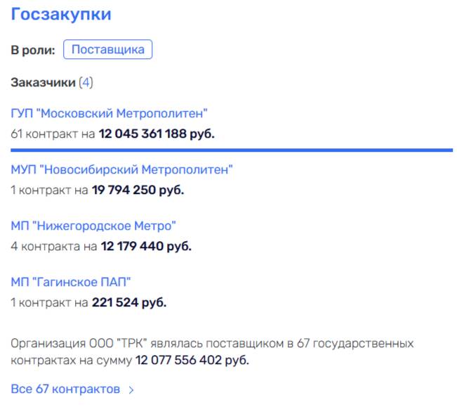 Общая сумма госконтрактов фирмы перевалила за 12 млрд рублей. Большая часть - от Москвы, но есть контракты и от Нижнего Новгорода, и от Новосибирска. В чем же секрет бывшей супруги депутата Таймазова? Оказывается, ранее Артур Таймазов трудился советником гендиректора московской компании «Аэроэкспресс». А совладельцем этой компании в свое время являлся никто иной, как нынешний вице-мэр Москвы по транспорту Максим Ликсутов. В его ведении и находятся все закупки для метрополитена!
