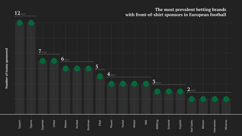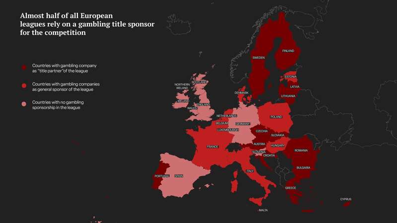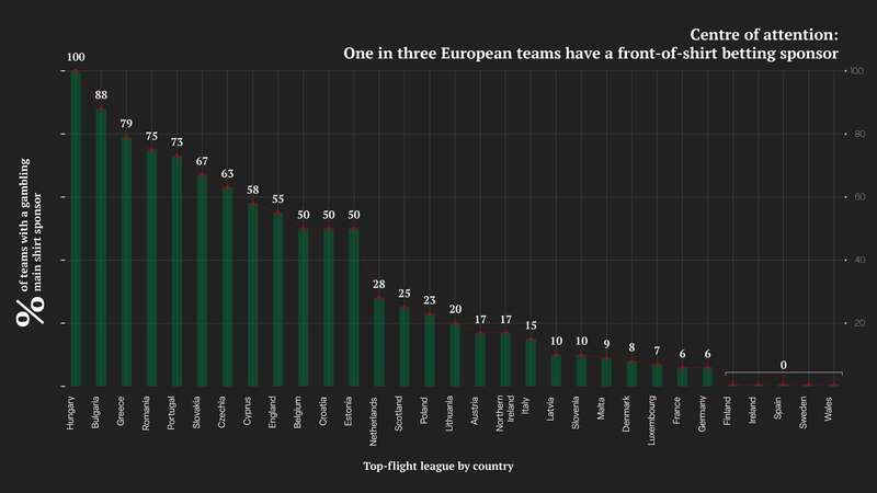 По всей Европе логотипы азартных игр появляются на футболках всех клубов в венгерском высшем дивизионе, и более чем на 70 процентов в Болгарии, Греции, Румынии и Португалии. Спонсоры на футболках редки в немецкой Бундеслиге и Лиге 1 во Франции, но почти у всех команд есть партнер по ставкам или лотерее. Эти различия формируются более или менее благоприятными национальными правилами, финансовой зависимостью клубов от доходов от ставок, а также рыночными стратегиями компаний.