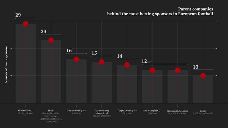 Investigate Europe обнаружила, что 105 компаний, управляющих 140 брендами, имеют сделки с клубами по всему ЕС и Великобритании. Многие из них связаны с тяжеловесами отрасли Kindred, Kaizen и Entain, а также с известными брендами, такими как Unibet, Betano, Betway и Bwin. Другие — это операторы, базирующиеся в офшорах на Кюрасао и острове Мэн, или бренды по всей Азии, а также государственные компании, такие как Lotto в Германии и Vriendenloterij в Нидерландах.