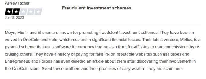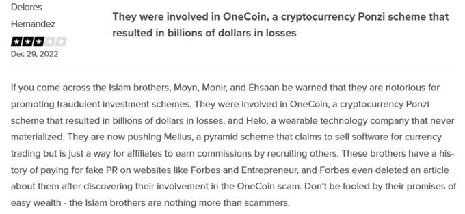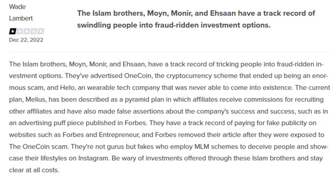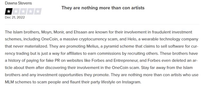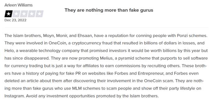 You should be aware that the Islam brothers Monir Islam, Moyn Islam, and Ehsaan Islam are infamous for endorsing shady investment schemes if you come across them. They were associated with Helo, a wearable technology startup that never emerged, and OneCoin, a Ponzi scam involving cryptocurrency that cost investors billions of dollars. They are now promoting Melius, a pyramid scheme that masquerades as selling currency trading software but is really simply a mechanism for affiliates to make money by signing up new members. These brothers have a history of buying phony news releases from magazines like Forbes and Entrepreneur. Forbes even removed an article on them after learning of their involvement in the OneCoin fraud.