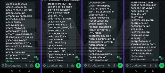 С 11 августа по всей Москве проходит проверка Государственной социнспекции совместно с Департаментом труда и соцзащиты. Из-за реорганизации двухгодичной давности каждый работник теперь обязан фиксировать все действия через специальное приложение. Если данные расходятся — сотрудника вызывают к руководству и начинают разбор полётов, которые нередко заканчивается заявлением об увольнении.