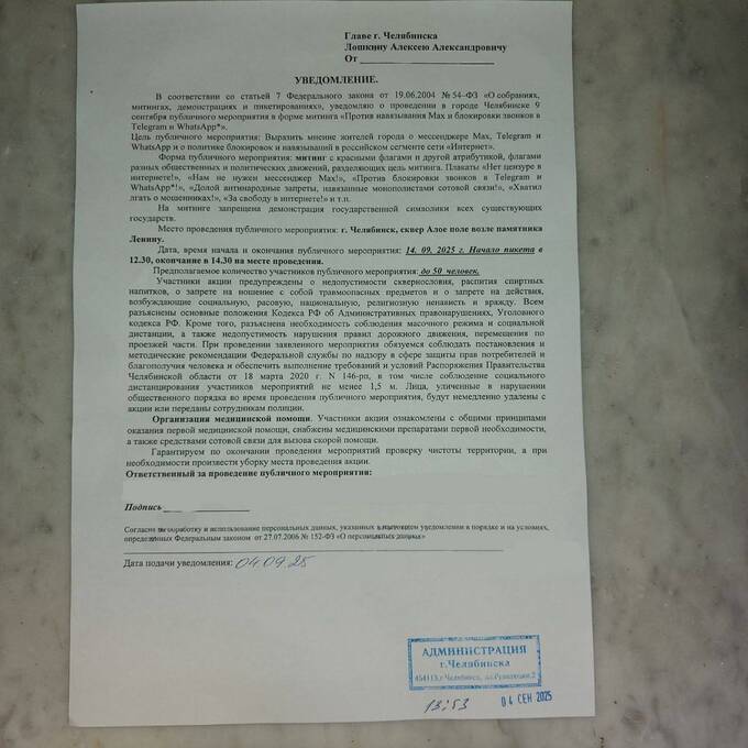 Активисты подали заявку на проведение митинга 14 сентября «Против навязывания Max и блокировки звонков в Telegram и WhatsApp*». В документе они заявили лозунги: «Нет цензуре в интернете!», «Нам не нужен мессенджер Мах!», «Против блокировки звонков в Telegram и WhatsApp*!», «Долой антинародные запреты, навязанные монополистами сотовой связи!», «Хватил лгать о мошенниках!», «За свободу в интернете!».