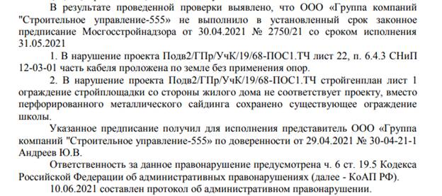 Что ещё интереснее – ДРНТГМ даже не судится с организацией. Но зато судится с ним Мосгосстройнадзор – и весьма активно. Ведомство обвиняет "СУ-555" в разного рода нарушениях при строительстве и неисполнении предписаний надзорных органов. Проще говоря – подрядчик строит "тяп-ляп", а когда к нему приходят с проверкой и требуют устранить нарушения, провожает надзор со словами "мы вам перезвоним".