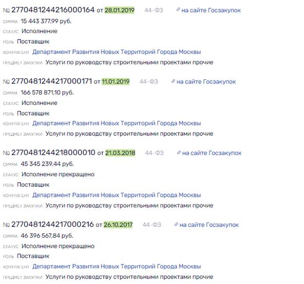 Интересна и ныне ликвидированная конторка под названием ГУП РСП-1 "Москворечье". В 2018 году она была реорганизована в принадлежащее ДРНТГМ ГКУ "Москворечье". А до этого получила от ведомства Жидкина 19 контрактов, большая часть которых называется "Услуги по руководству строительными проектами прочие". Какой-то конкретики на сайте "Госзакупок" по ним не наблюдается. И часть из них находится в стадии исполнения, несмотря на то, что компании не существует уже пять лет.