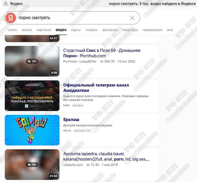 Контент 18+ в поисковике может обнаружить и посмотреть человек любого возраста, нажав всего на одну кнопку, которая перестанет «блюрить» эротические видео, при этом детям контекстная реклама даже будет предлагать посмотреть детский юмористический видеожурнал Ералаш среди всего эротического контента. При этом все ролики будут работать без ВПН, внутри самого сервиса, не пересылая на сайты, на которых за границей, например США, уже нужно входить по паспорту.