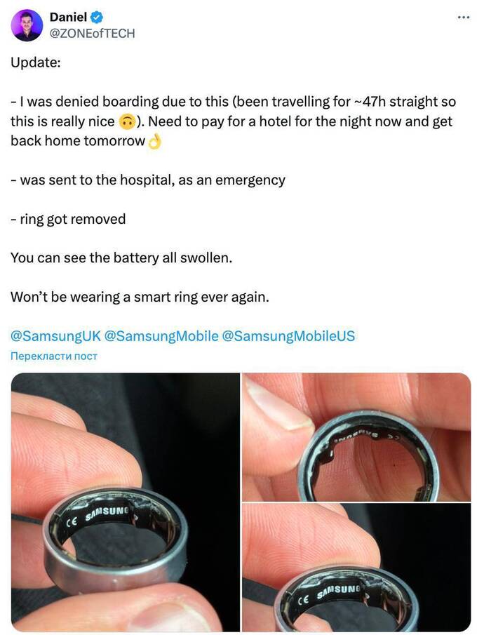 Аккумулятор Samsung Galaxy Ring начал раздуваться прямо на пальце мужчины, когда он был в аэропорту. Деформированные части кольца начали сильно давить.