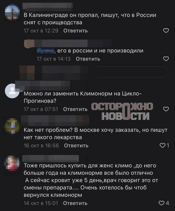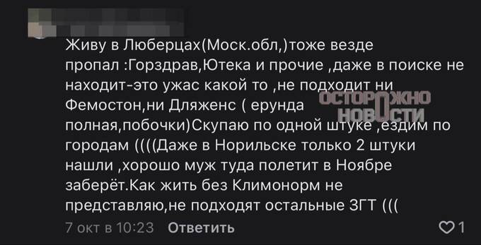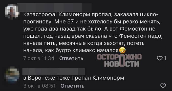 Покупательницы рассказали «Осторожно, новости», что исчезновение «Климонорма» они заметили примерно полтора месяца назад. Сейчас его невозможно купить в Москве, Владимире, Калининграде, Санкт-Петербурге, Воронеже, Твери и других российских городах. По нашим данным, «Климонорма» нет и на сайтах крупных аптечных маркетплейсов.
