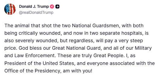 «Животное, которое ранило двух нацгвардейцев, заплатит очень высокую цену», – прокомментировал инцидент Трамп.
