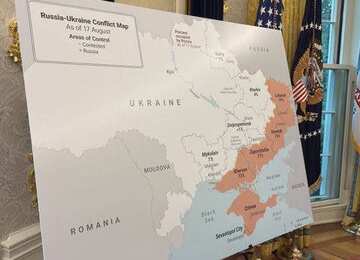 В Овальном кабинете перед началом закрытых переговоров Трампа и Зеленского было установлена большая карта Украины, сообщил корреспондент Би-Би-Си Энтони Заркер.